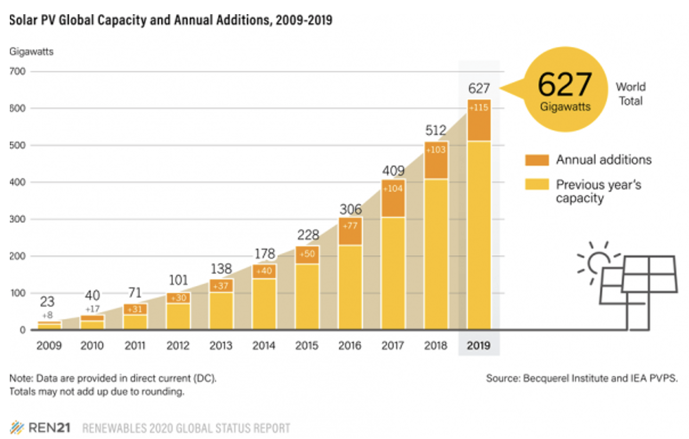 Solar is now the cheapest form of power generation (as low as 10 €/MWh in tenders in Europe and the Middle East) and the largest source of new power capacity globally, with 175 GW installed in 2021.